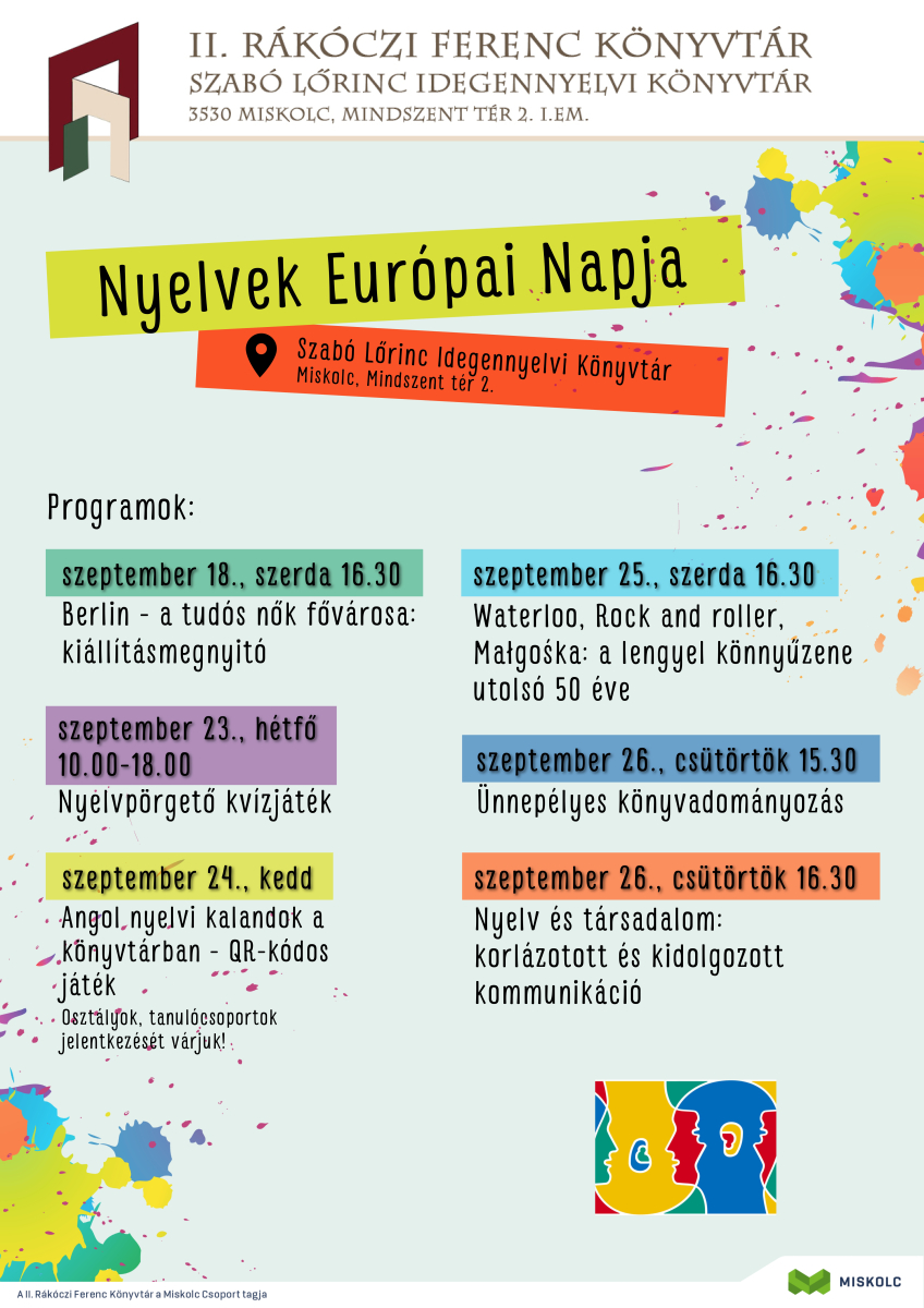 Igazi programkavalkáddal készül a Nyelvek Európai Napjár a Szabó Lőrinc Idegennyelvi Könyvtár (Miskolc, Mindszent tér 2.). Az intézmény szeptember 18 és 26 között összesen hat rendezvénnyel várja az érdeklődőket.