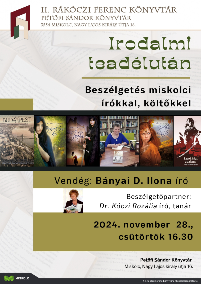 Folytatódik az Irodalmi teadélután című program, melyben miskolci írókkal, költőkkel beszélget dr. Kóczi Rozália író, tanár a Petőfi Sándor Könyvtárban (Miskolc, Nagy Lajos király útja 16.). A mostani vendég 2024. november 28-án, csütörtökön fél öttől Bányai D. Ilona író lesz. Minden érdeklődőt szeretettel várunk rendezvényünkre.