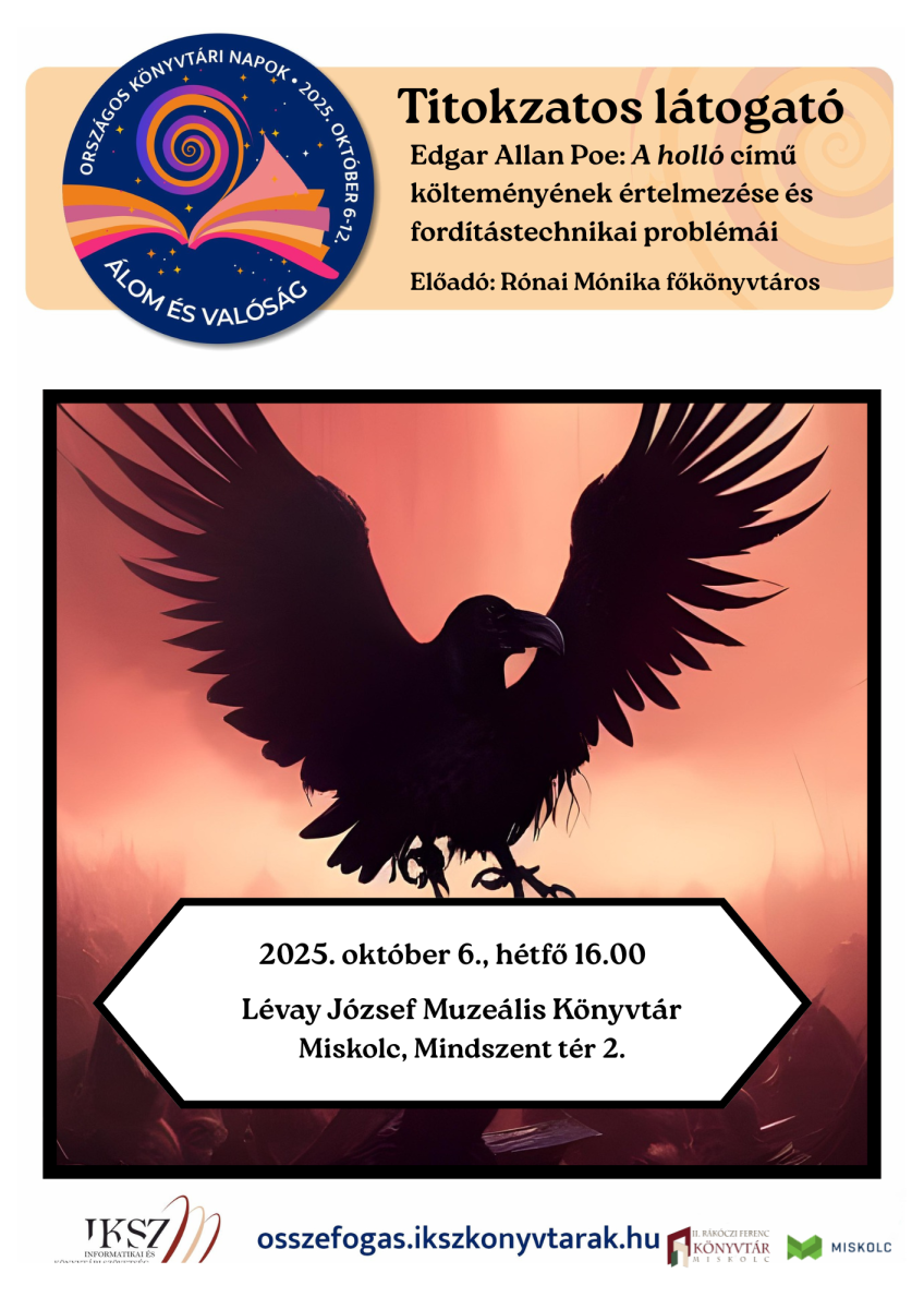 Edgar Allan Poe: A holló című költeményének értelmezéséről és fordítástechnikai problémáiról tart előadást Rónai Mónika főkönyvtáros a Lévay József Muzeális Könyvtárban (Miskolc, Mindszent tér 2.). A Titokzatos látogató címet viselő előadás 2025. október 6-án hétfőn délután 4 órakor kezdődik.