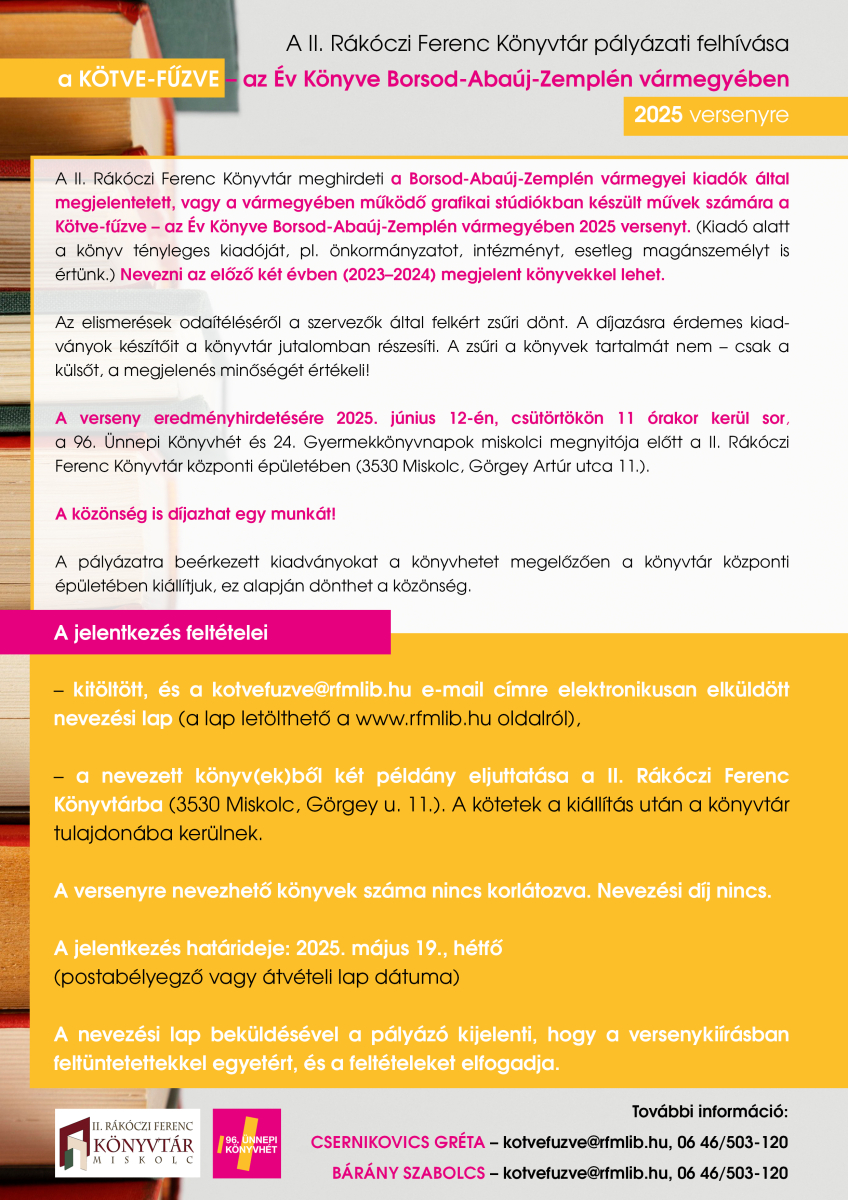A Kötve-fűzve – az Év Könyve Borsod-Abaúj-Zemplén vármegyében 2025 versenyre az előző két évben (2023-ban és 2024-ben) megjelent kötetekkel lehet nevezni 2025. május 19-ig. Az úgynevezett „kiadóvállalatok” mellett önkormányzatok, intézmények és magánszemélyek kiadásában megjelent köteteket is várunk. A versenyre nevezhető könyvek száma nincs korlátozva, és nevezési díjat sem kell fizetni. A versenyre a kitöltött, és a kotvefuzve@rfmlib.hu e-mail-címre elküldött nevezési lappal lehet jelentkezni, a kiválasztott könyv, vagy könyvek két példányát a II. Rákóczi Ferenc Könyvtárba (3530 Miskolc, Görgey A. u. 11.) kell eljuttatni. A nevezési lapot és a felhívást honlapunkról töltheti le.