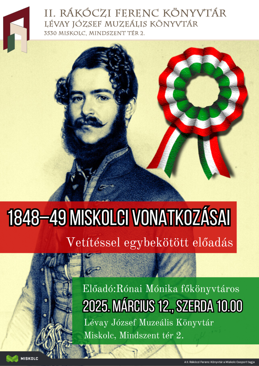 Az 1848–49 forrdalom és szabadságharc miskolci vonatkozásait mutatja be Rónai Mónika főkönyvtáros ismeretterjesztő előadása 2025. március 12-én, szerdán 10 órakor a Lévay József Muzeális Könyvtárban (Miskolc, Mindszent tér 2.).
