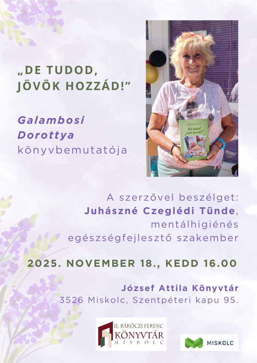 De tudod, jövök hozzád! ezt a címet viseli Galambosi Dorotty könyve, melynek bemutatója 2025. november 18-án, kedden 16.00 órától lesz a József Attila Könyvtárban (3526 Miskolc, Szentpéteri kapu 95.). A szerzővel Juhászné Czeglédi Tünde, mentálhigiénés egészségfejlesztő szakember beszélget.