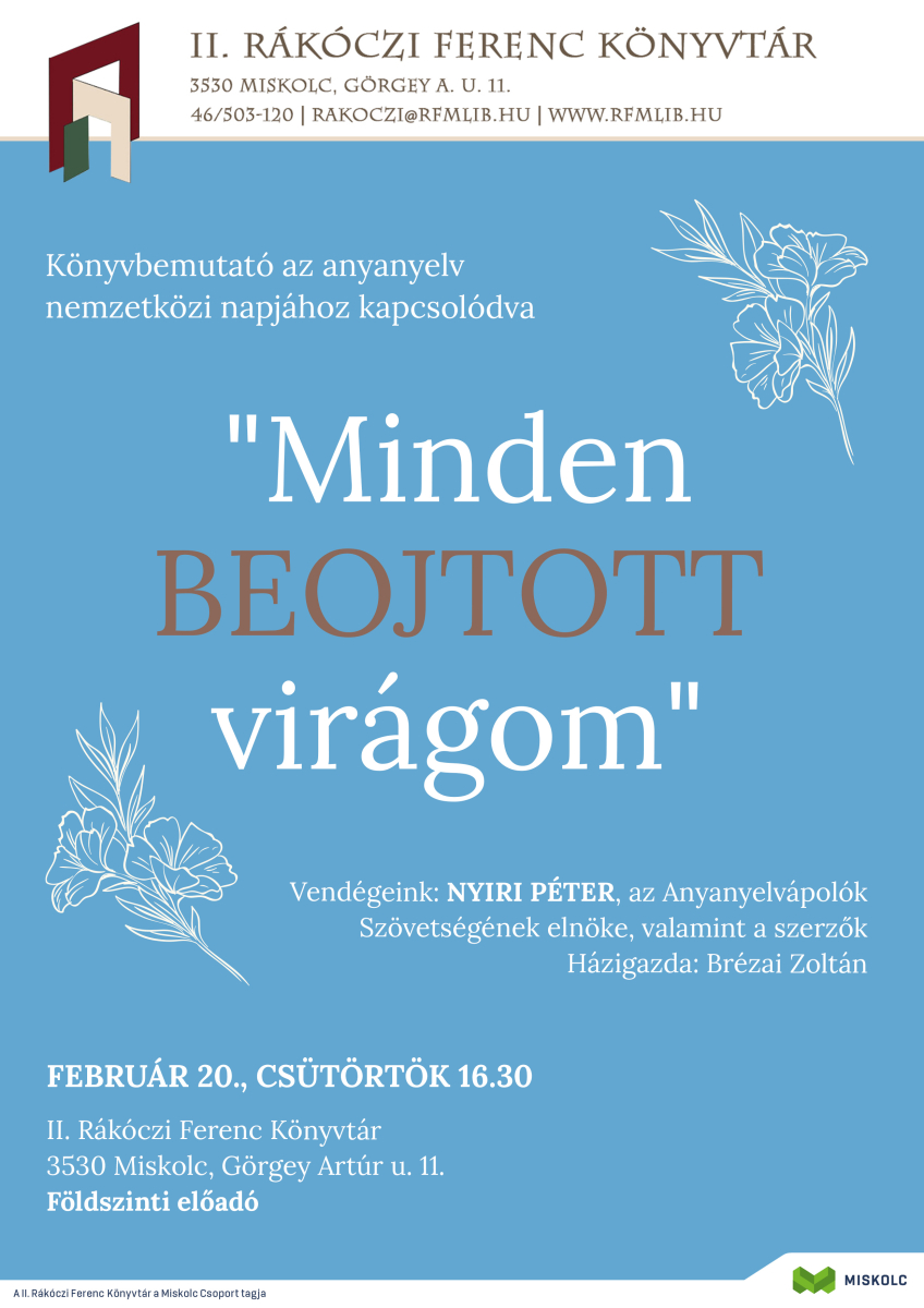 "Minden beojtott virágom" ezt a címet viseli az Anyanyelvápolók Szövetsége gondozásában tavaly ősszel megjelent kötet. A könyvbemutatót 2025. február 20-án, csütörtökön délután fél ötkor tartjuk a II. Rákóczi Ferenc Könyvtárban (Miskolc, Görgey A. u. 11.), az anyanyelv nemzetközi napjához kapcsolódva. Vendégeink lesznek Nyiri Péter az Anyanyelvápolók Szövetségének elnöke, valamnint a szerzők.