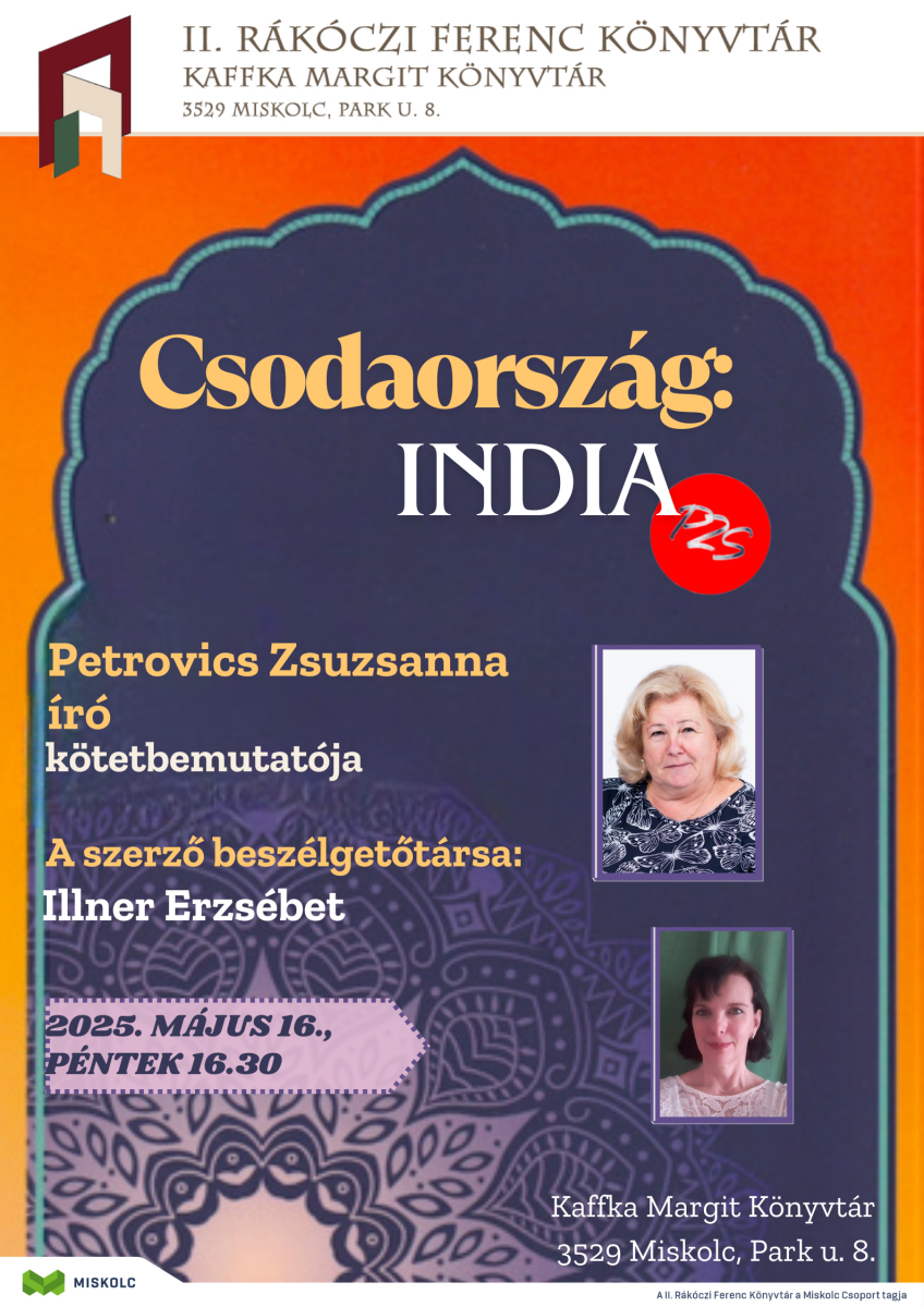 Csodaország: India címmel mutatjuk be Petrovics Zsuzsanna író legújabb kötetét 2025. május 16-án, pénteken délután fél öttől a Kaffka Margit Könyvtárban (3529 Miskolc, Park u. 8.). A szerzővel Illner Erzsébet beszélget.
