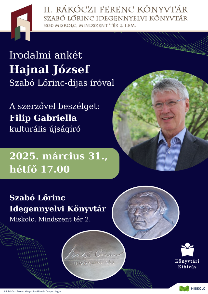 Hajnal József Szabó Lőrinc-díjas író lesz a Szabó Lőrinc Idegennyelvi Könyvtár (Miskolc, Mindszent tér 2.) vendége 2025. március 31-én, hétfőn 17 órától. A szerzővel Filip Gabriella kulturális újságíró beszélget.