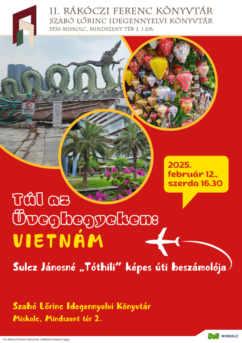 Túl az Üveghegyeken: Vietnám címmel tart képes úti beszámolót Sulcz Jánosné „Tóthil” 2025. február 12-én, szerdán 16.30-tól a Szabó Lőrinc Idegennyelvi Könyvtárban (Miskolc, Mindszent tér 2.). Az érdekesnek ígérkező program igyekszik közelebb hozni olvasóinkhoz a távol-keleti különleges ország világát,kultúráját, valamint az ott élő emberek mindennapjait.