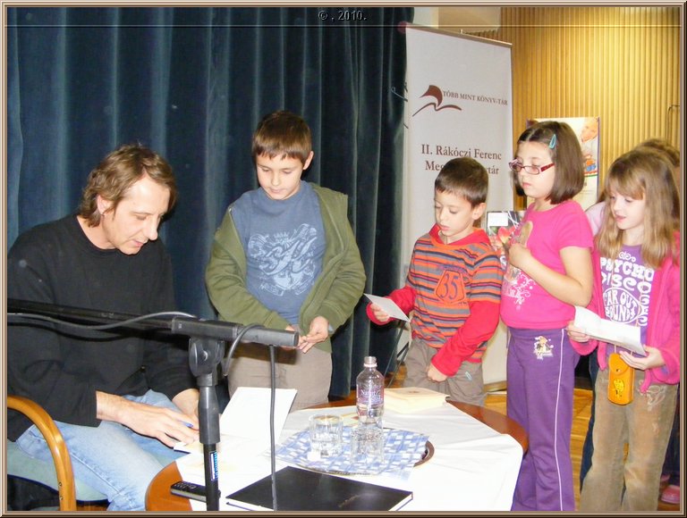 Csillagszedő Márió, Emese almája, Visszafelé hull a hó, Liliputi trónkövetelők és még számtalan mese, mondóka, dudorászós versike szerzőjével találkozhatunk – a költészet napja tiszteletére – április 10-én, szerdán délután 2 órától a II. Rákóczi Ferenc Megyei és Városi Könyvtárban (Miskolc, Görgey A. u. 11.). Szerintem se ki se maradjon otthon szerda délután! – üzenik a könyvtárosok a költőtől kölcsönzött kötetcím – Szerintem mindenki maradjon otthon vasárnap délután – átköltésével. Kiss Ottó korábban is járt már a könyvtárunkban, akkor készült ez a fotó.