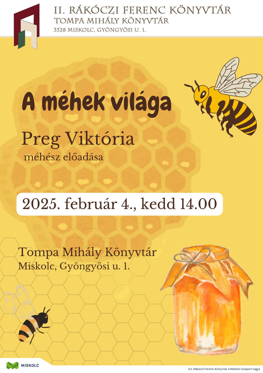 A méhek világa címmel tart előadást 2025.február 4-én, kedden 14.00 órától Tompa Mihály Könyvtárban (Miskolc, Gyöngyösi u. 1.) Preg Viktória méhész. Az érdeklődők új iinformációkkal érdekességekkel ismerkedhetnek meg a méhekkel kapcsolatban.