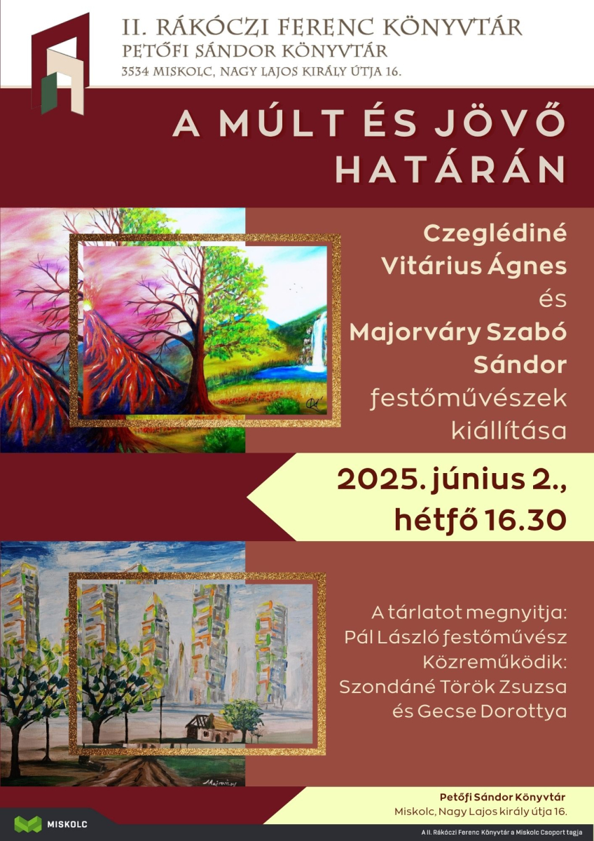 A múlt és jövő határán címmel nyílik kiállítás 2025. június 2-án, hétfőn délután fél öttől a Petőfi Sándor Könyvtárban (Miskolc, Nagy Lajos király útja 16.). A tárlaton Czeglédiné Vitárius Ágnes és Majorváry Szabó Sándor festőművészek alkotásait tekinthetik meg, a kiállítást Pál László festőművész nyitja meg, közreműködik: Szondáné Török Zsuzsa és Gecse Dorottya. A tárlat június 30-ig tekinthető meg.