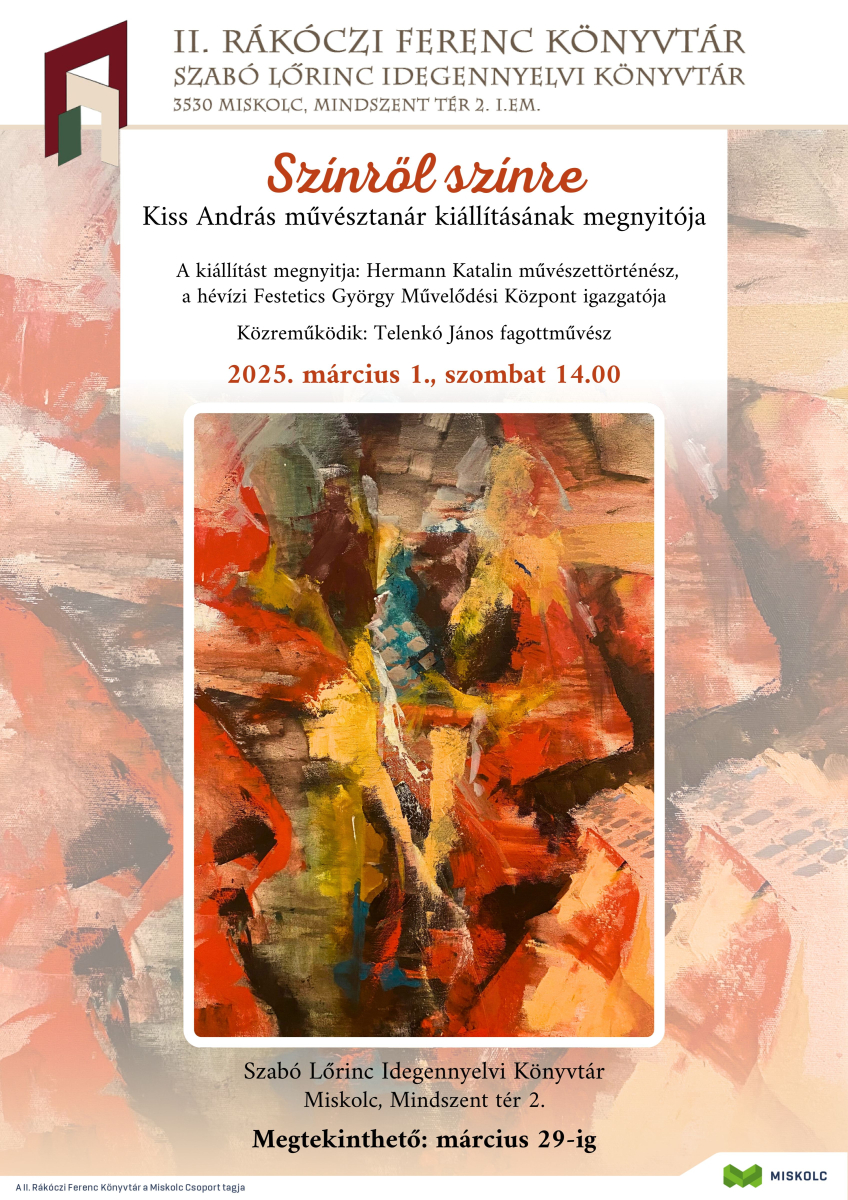 Kiss András művésztanár  munkáiból nyílik kiállítás 2025. március 1-én, szombaton 14.00 órakor a Szabó Lőrinc Idegennyelvi Könyvtárban (Miskolc, Mindszent tér 2.). A tárlatot Hermann Katalin művészettörténész, a hévízi Festetics György Művelődési Központ igazgatója nyitja meg. Közreműködik: Telenkó János fagottművész. A kiállítás március 29-ig tekinthető meg.