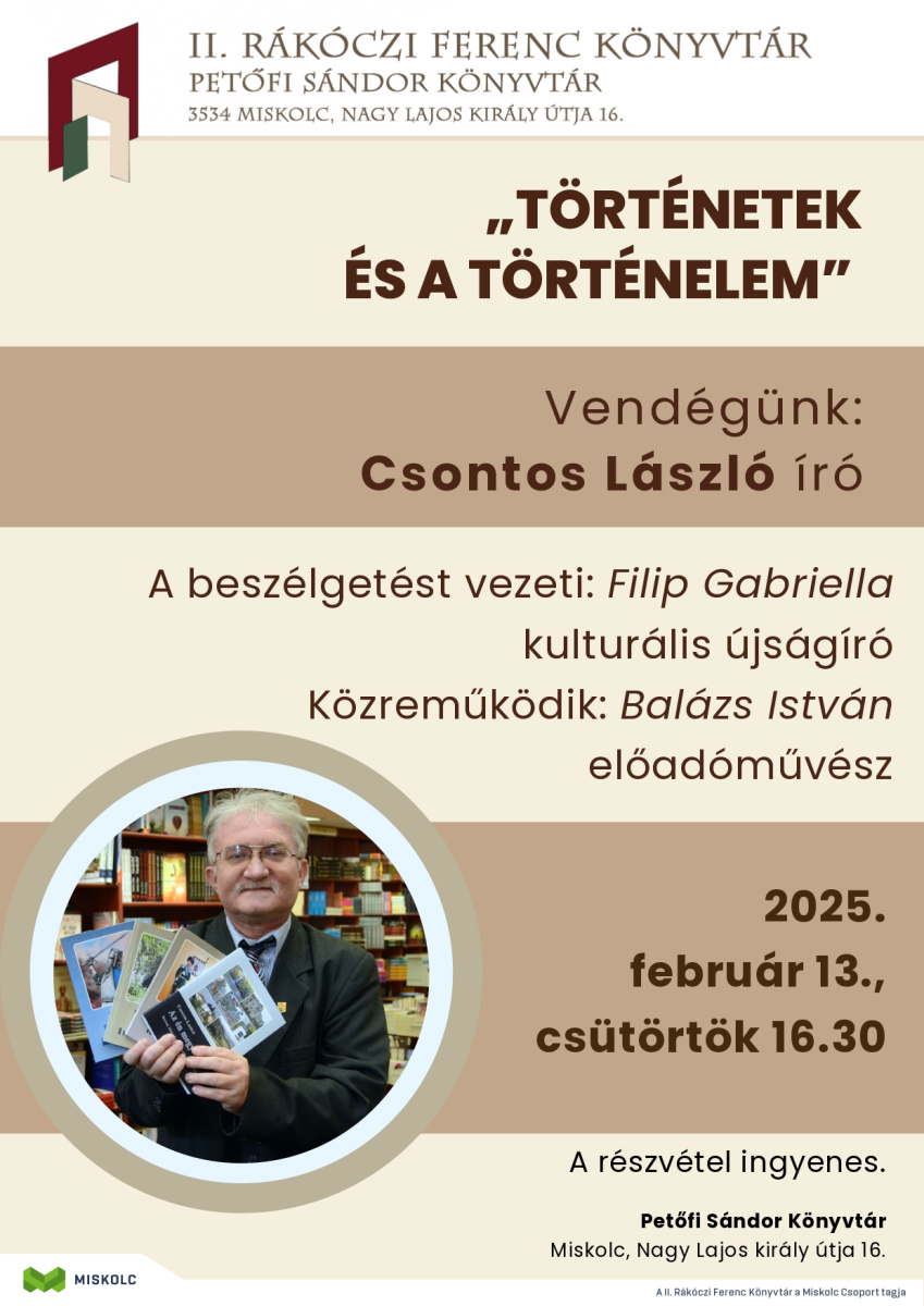 Csontos László író lesz a Petőfi Sándor Könyvtár (Miskolc, Nagy Lajos király útja 16.) vendége 2025. február 13-án, csütörtökön délután fél öttől. A szerzővel Filip Gabriella kulturális újságíró beszélget. Közreműködik: Balázs István előadóművész.