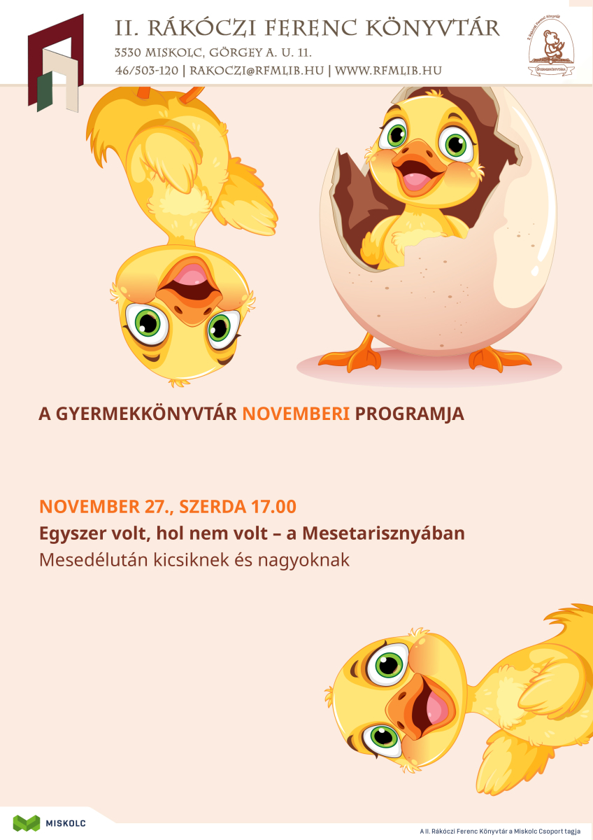 Új időpontban rendezzük meg a II. Rákóczi Ferenc Könyvtár központi épületében (Miskolc, Görgey u. 11.) a Mesetaqrisznya foglalkozást. Gyermekkönyvtárunk programjára 2024. november 27-én, szerdán 17 órától kerül sor.